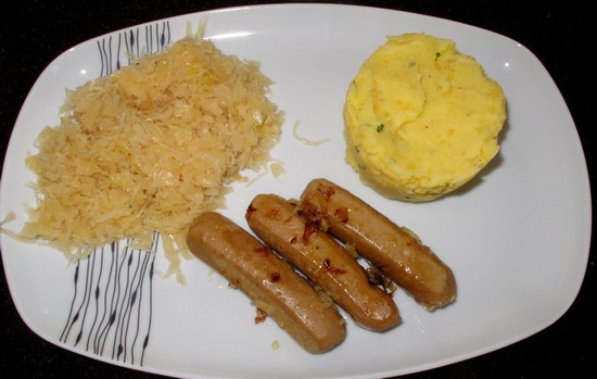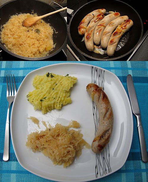 Bratwurst z kiszoną kapustą i puree ziemniaczanym