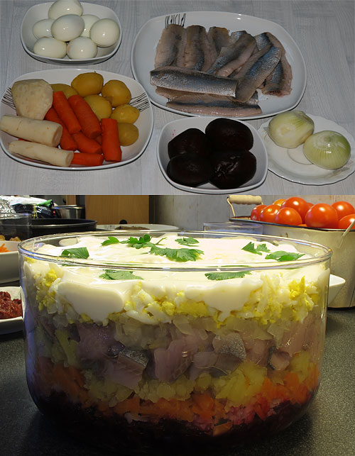 Typische Zutaten sind Heringe, Kartoffeln, Karotten, Rote Bete, Zwiebeln, Eier und Mayonnaise. Am besten bereitet man den Salat am Abend zu und stellt ihn über Nacht in den Kühlschrank, damit sich die Aromen gut miteinander verbinden.