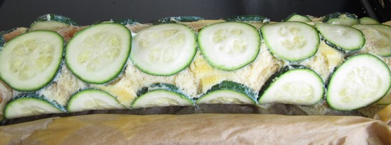 Zubereitung der Zucchini: Schneide die Zucchini in dünne Scheiben (am besten mit einer Mandoline, wenn vorhanden). Verteile sie gleichmäßig auf einem mit Backpapier ausgelegten Backblech.