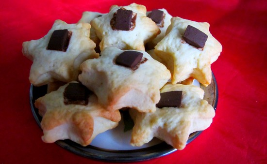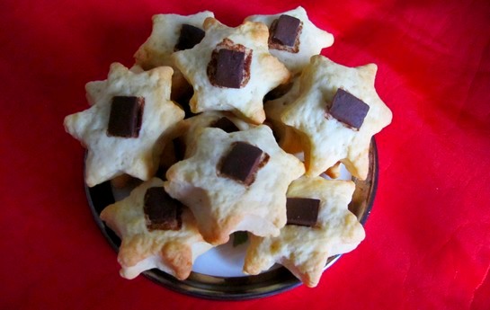 Nadziewanie czekoladą: Na środku każdego wyciętego ciasteczka położyć mały kawałek gorzkiej czekolady. Można użyć gotowych, specjalnych kawałków do pieczenia lub samemu pokroić czekoladę.